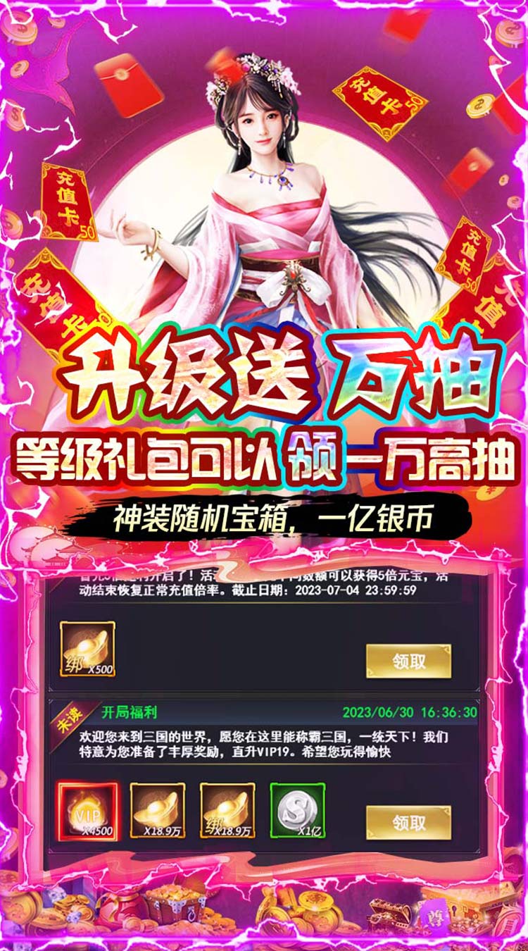 上线送满V,充值比例1:100,送顶级神将